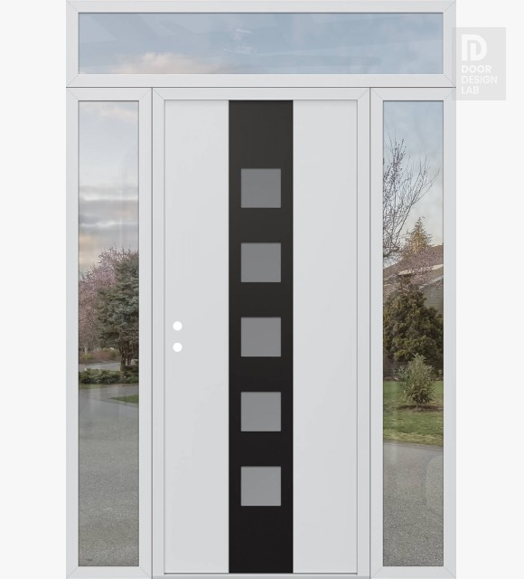 Modern Steel Front Door DIAMOND A13 64" X 96" BLACK/WHITE FROSTED GLASS PANEL BLACK LHI WITH 2 SIDELITES AND TRANSOM CLEAR GLASS