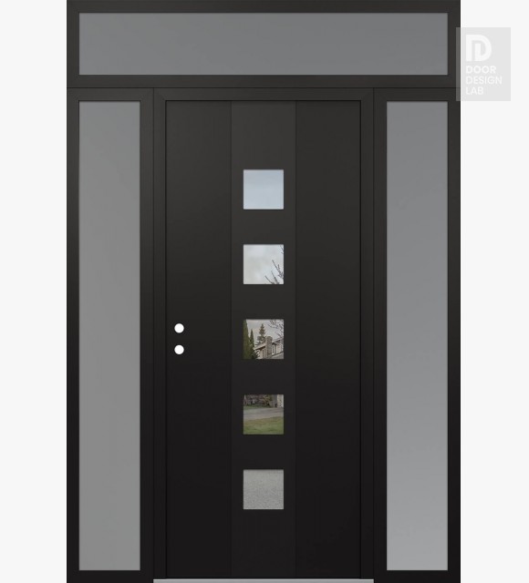 Modern Steel Front Door DIAMOND A13 68" X 96" BLACK/BLACK CLEAR GLASS PANEL BLACK LHI WITH 2 SIDELITES AND TRANSOM FROSTED GLASS