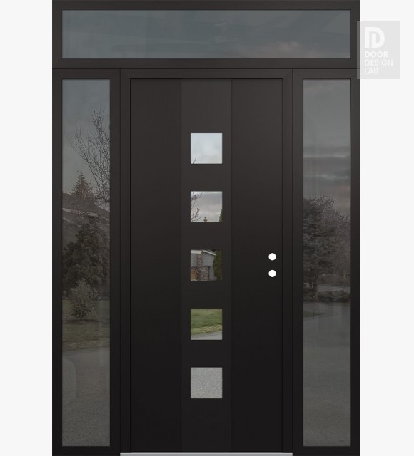 Modern Steel Front Door DIAMOND A13 68" X 96" BLACK/BLACK CLEAR GLASS PANEL BLACK RHI WITH 2 SIDELITES AND TRANSOM MIRRORED GLASS