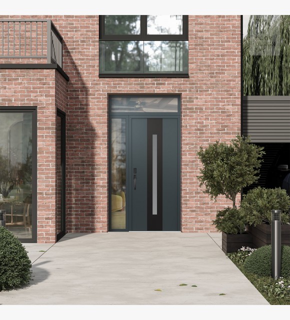 Modern Steel Front Door DIAMOND A2 50" X 96" ANTHRACITE/ANTHRACITE FROSTED GLASS PANEL BLACK RHI WITH SIDELITE AND TRANSOM CLEAR GLASS