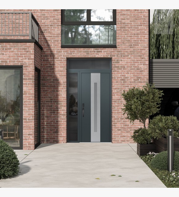 Modern Steel Front Door DIAMOND A2 50" X 96" ANTHRACITE/ANTHRACITE FROSTED GLASS PANEL STAINLESS STEEL RHI WITH SIDELITE AND TRANSOM MIRRORED GLASS