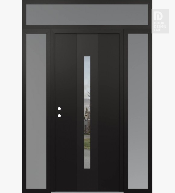 Modern Steel Front Door DIAMOND A2 60" X 96" BLACK/BLACK CLEAR GLASS PANEL BLACK LHI WITH 2 SIDELITES AND TRANSOM FROSTED GLASS