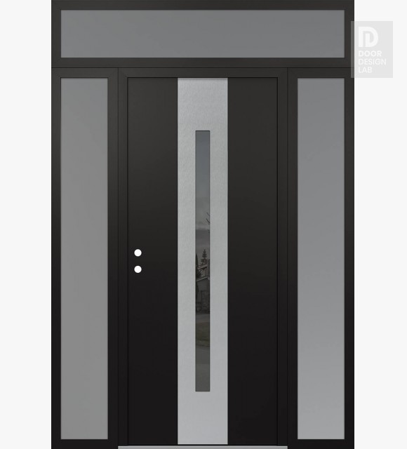Modern Steel Front Door DIAMOND A2 60" X 96" BLACK/BLACK MIRRORED GLASS PANEL STAINLESS STEEL LHI WITH 2 SIDELITES AND TRANSOM FROSTED GLASS