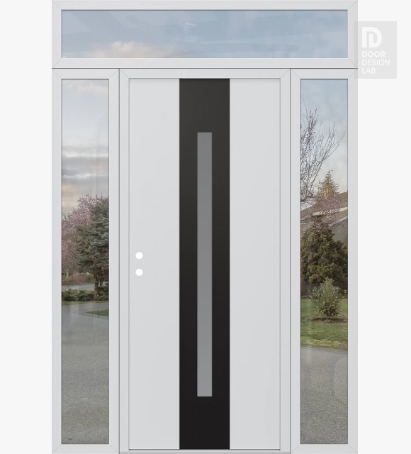 Modern Steel Front Door DIAMOND A2 60" X 96" BLACK/WHITE FROSTED GLASS PANEL BLACK LHI WITH 2 SIDELITES AND TRANSOM CLEAR GLASS