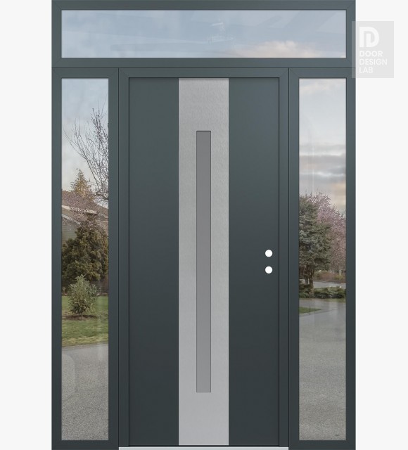 Modern Steel Front Door DIAMOND A2 64" X 96" ANTHRACITE/ANTHRACITE FROSTED GLASS PANEL STAINLESS STEEL RHI WITH 2 SIDELITES AND TRANSOM CLEAR GLASS