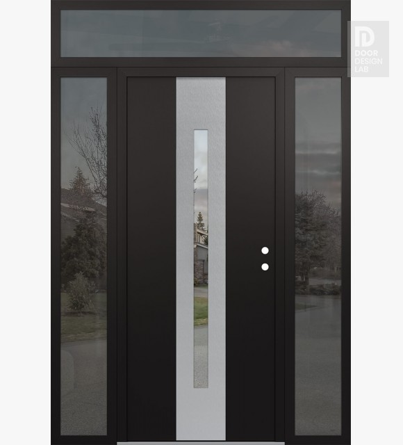 Modern Steel Front Door DIAMOND A2 64" X 96" BLACK/BLACK CLEAR GLASS PANEL STAINLESS STEEL RHI WITH 2 SIDELITES AND TRANSOM MIRRORED GLASS