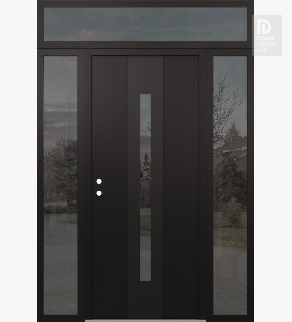 Modern Steel Front Door DIAMOND A2 68" X 96" BLACK/BLACK MIRRORED GLASS PANEL BLACK LHI WITH 2 SIDELITES AND TRANSOM MIRRORED GLASS