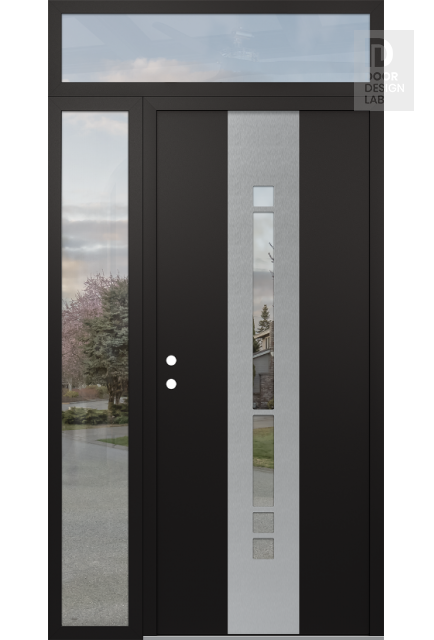 Modern Steel Front Door DIAMOND A3 48" X 96" BLACK/BLACK CLEAR GLASS PANEL STAINLESS STEEL LHI WITH SIDELITE AND TRANSOM CLEAR GLASS