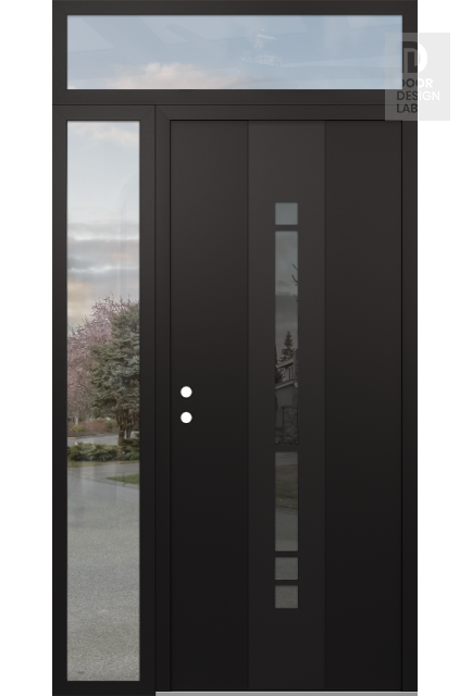 Modern Steel Front Door DIAMOND A3 48" X 96" BLACK/BLACK MIRRORED GLASS PANEL BLACK LHI WITH SIDELITE AND TRANSOM CLEAR GLASS