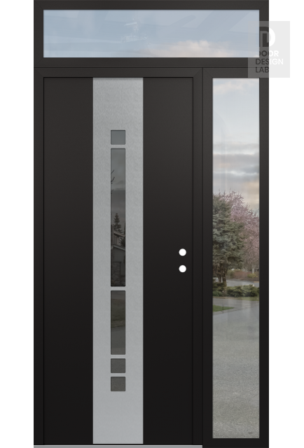 Modern Steel Front Door DIAMOND A3 48" X 96" BLACK/BLACK MIRRORED GLASS PANEL STAINLESS STEEL RHI WITH SIDELITE AND TRANSOM CLEAR GLASS