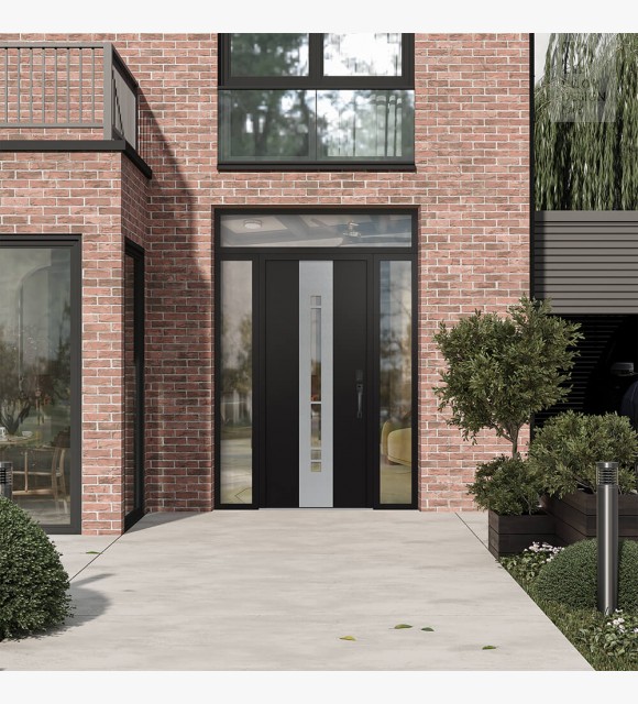 The door unit kit includes a transom and two sidelites, which are decorative stationary sections installed above, to the left and to the right of the exterior door.