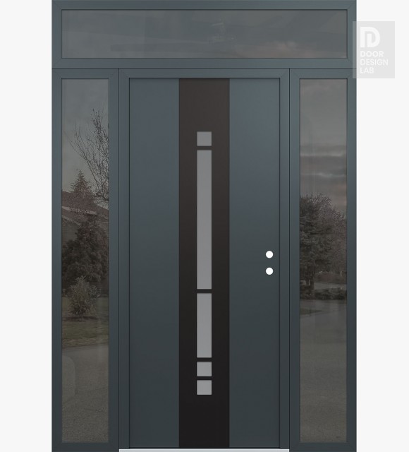 Modern Steel Front Door DIAMOND A3 64" X 96" ANTHRACITE/ANTHRACITE FROSTED GLASS PANEL BLACK RHI WITH 2 SIDELITES AND TRANSOM MIRRORED GLASS