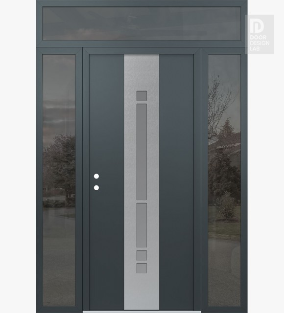 Modern Steel Front Door DIAMOND A3 64" X 96" ANTHRACITE/ANTHRACITE FROSTED GLASS PANEL STAINLESS STEEL LHI WITH 2 SIDELITES AND TRANSOM MIRRORED GLASS