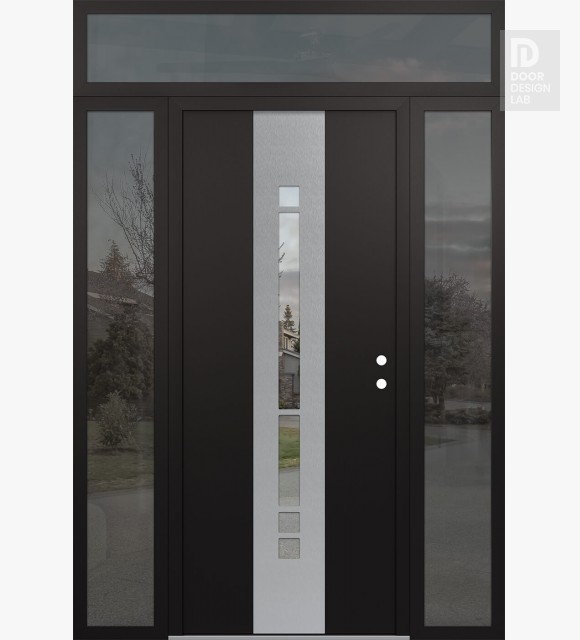 Modern Steel Front Door DIAMOND A3 64" X 96" BLACK/BLACK CLEAR GLASS PANEL STAINLESS STEEL RHI WITH 2 SIDELITES AND TRANSOM MIRRORED GLASS