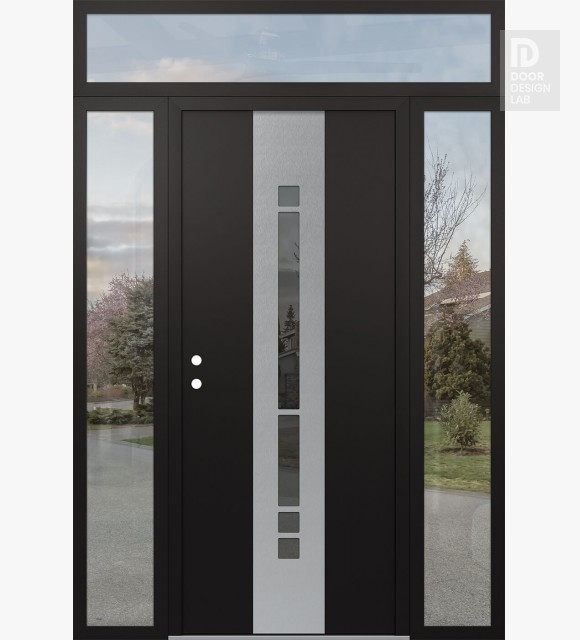 Modern Steel Front Door DIAMOND A3 64" X 96" BLACK/BLACK MIRRORED GLASS PANEL STAINLESS STEEL LHI WITH 2 SIDELITES AND TRANSOM CLEAR GLASS