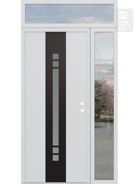 Modern Steel Front Door DIAMOND A4 52" X 96" BLACK/WHITE FROSTED GLASS PANEL BLACK RHI WITH SIDELITE AND TRANSOM CLEAR GLASS