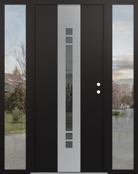 Modern Steel Front Door DIAMOND A4 60" X 80" BLACK/BLACK MIRRORED GLASS PANEL STAINLESS STEEL RHI WITH 2 SIDELITES CLEAR GLASS