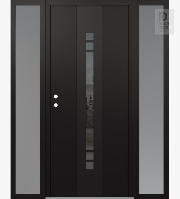 Modern Steel Front Door DIAMOND A4 64" X 80" BLACK/BLACK MIRRORED GLASS PANEL BLACK LHI WITH 2 SIDELITES FROSTED GLASS