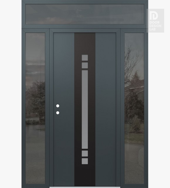 Modern Steel Front Door DIAMOND A4 64" X 96" ANTHRACITE/ANTHRACITE FROSTED GLASS PANEL BLACK LHI WITH 2 SIDELITES AND TRANSOM MIRRORED GLASS
