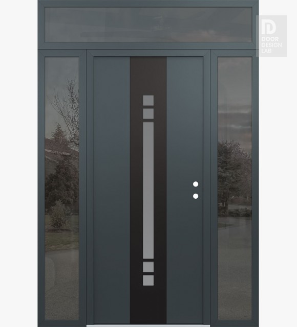Modern Steel Front Door DIAMOND A4 64" X 96" ANTHRACITE/ANTHRACITE FROSTED GLASS PANEL BLACK RHI WITH 2 SIDELITES AND TRANSOM MIRRORED GLASS