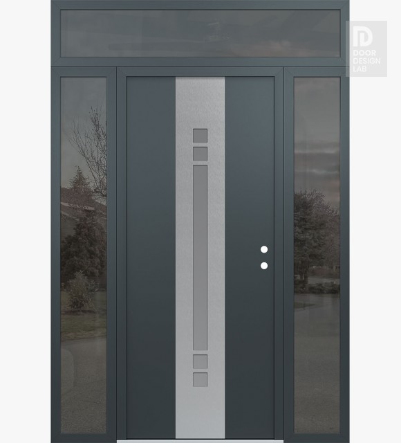 Modern Steel Front Door DIAMOND A4 64" X 96" ANTHRACITE/ANTHRACITE FROSTED GLASS PANEL STAINLESS STEEL RHI WITH 2 SIDELITES AND TRANSOM MIRRORED GLASS