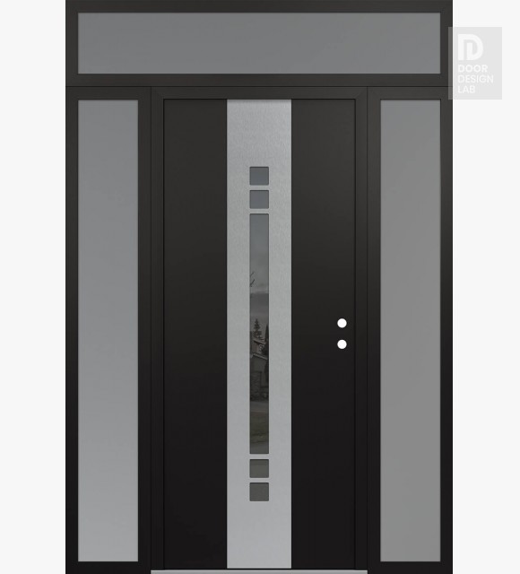 Modern Steel Front Door DIAMOND A4 64" X 96" BLACK/BLACK MIRRORED GLASS PANEL STAINLESS STEEL RHI WITH 2 SIDELITES AND TRANSOM FROSTED GLASS