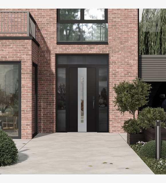 The door unit kit includes a transom and two sidelites, which are decorative stationary sections installed above, to the left and to the right of the exterior door.