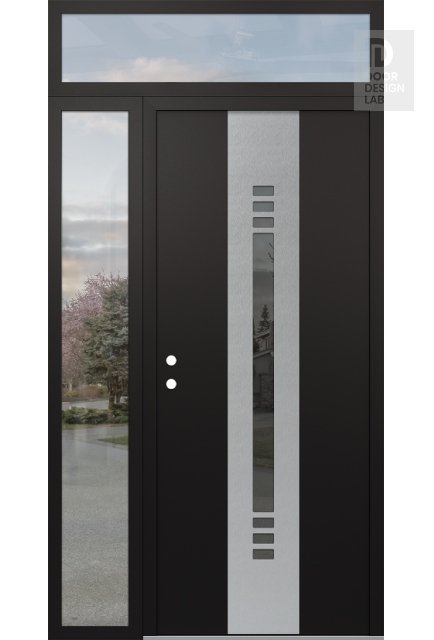 Modern Steel Front Door DIAMOND A5 48" X 96" BLACK/BLACK MIRRORED GLASS PANEL STAINLESS STEEL LHI WITH SIDELITE AND TRANSOM CLEAR GLASS