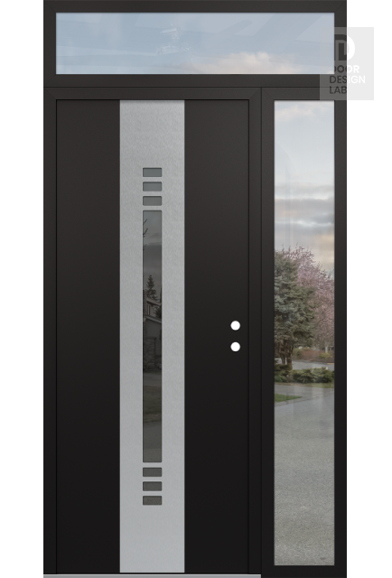 Modern Steel Front Door DIAMOND A5 48" X 96" BLACK/BLACK MIRRORED GLASS PANEL STAINLESS STEEL RHI WITH SIDELITE AND TRANSOM CLEAR GLASS