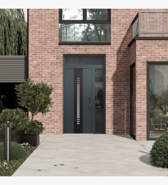 Modern Steel Front Door DIAMOND A5 50" X 96" ANTHRACITE/ANTHRACITE FROSTED GLASS PANEL BLACK LHI WITH SIDELITE AND TRANSOM MIRRORED GLASS