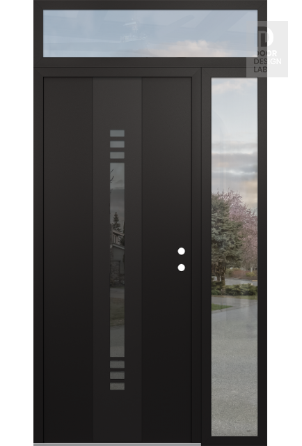 Modern Steel Front Door DIAMOND A5 52" X 96" BLACK/BLACK MIRRORED GLASS PANEL BLACK RHI WITH SIDELITE AND TRANSOM CLEAR GLASS