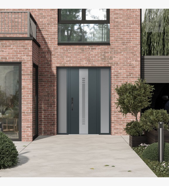 Modern Steel Front Door DIAMOND A5 60" X 80" ANTHRACITE/ANTHRACITE FROSTED GLASS PANEL STAINLESS STEEL RHI WITH 2 SIDELITES FROSTED GLASS