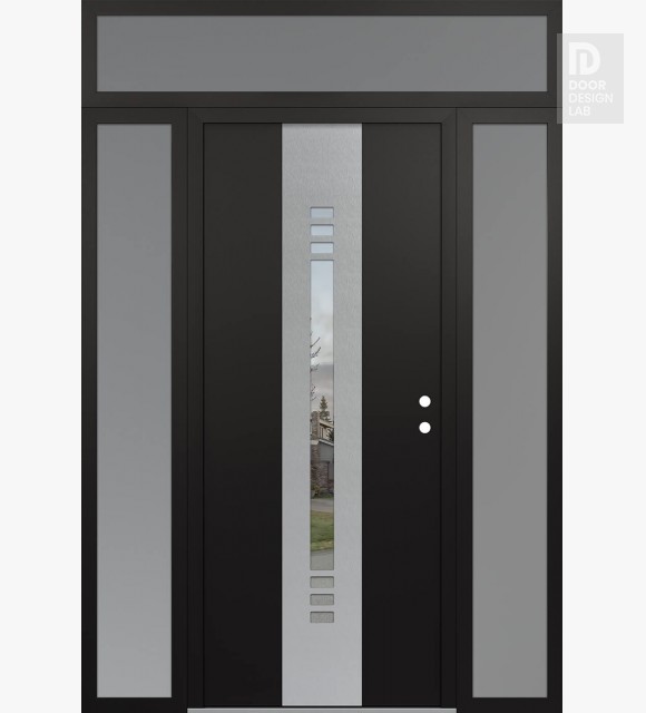Modern Steel Front Door DIAMOND A5 60" X 96" BLACK/BLACK CLEAR GLASS PANEL STAINLESS STEEL RHI WITH 2 SIDELITES AND TRANSOM FROSTED GLASS