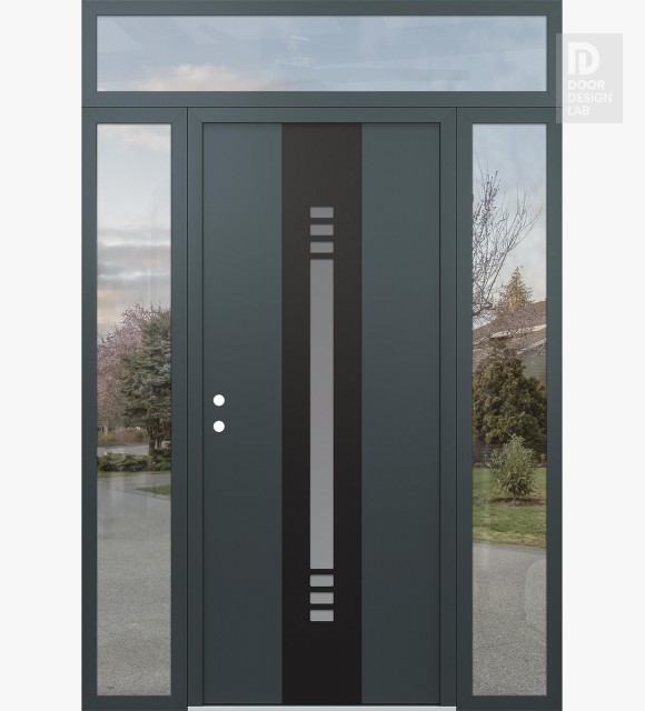 Modern Steel Front Door DIAMOND A5 64" X 96" ANTHRACITE/ANTHRACITE FROSTED GLASS PANEL BLACK LHI WITH 2 SIDELITES AND TRANSOM CLEAR GLASS