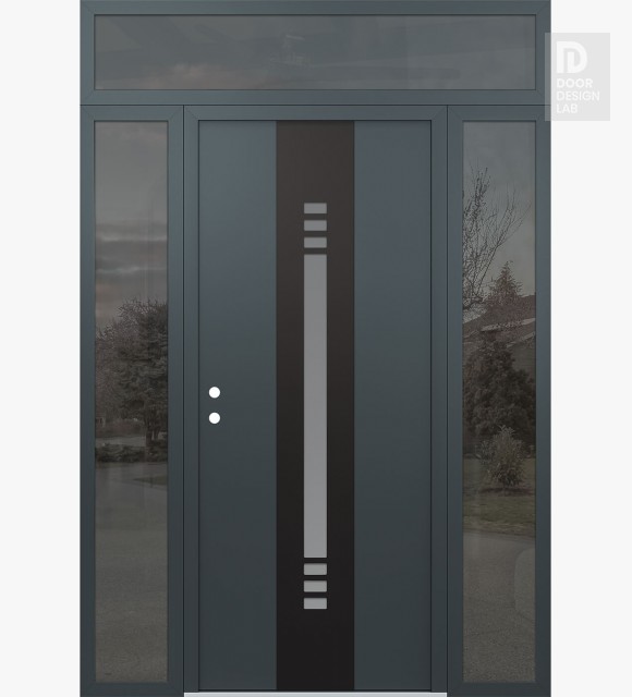 Modern Steel Front Door DIAMOND A5 64" X 96" ANTHRACITE/ANTHRACITE FROSTED GLASS PANEL BLACK LHI WITH 2 SIDELITES AND TRANSOM MIRRORED GLASS