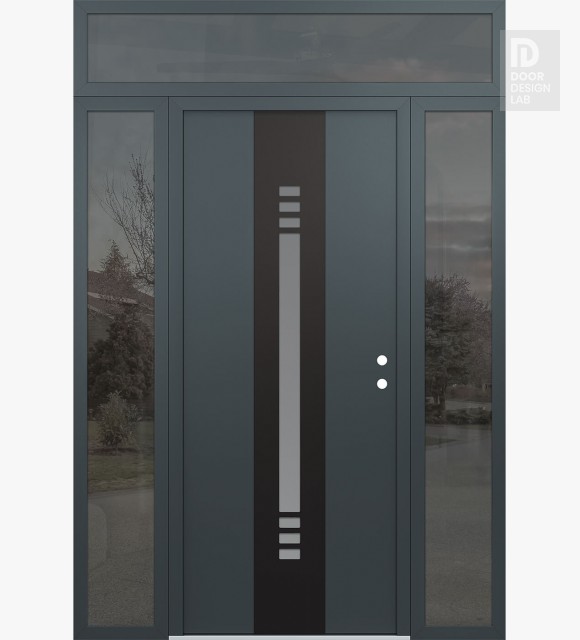 Modern Steel Front Door DIAMOND A5 64" X 96" ANTHRACITE/ANTHRACITE FROSTED GLASS PANEL BLACK RHI WITH 2 SIDELITES AND TRANSOM MIRRORED GLASS