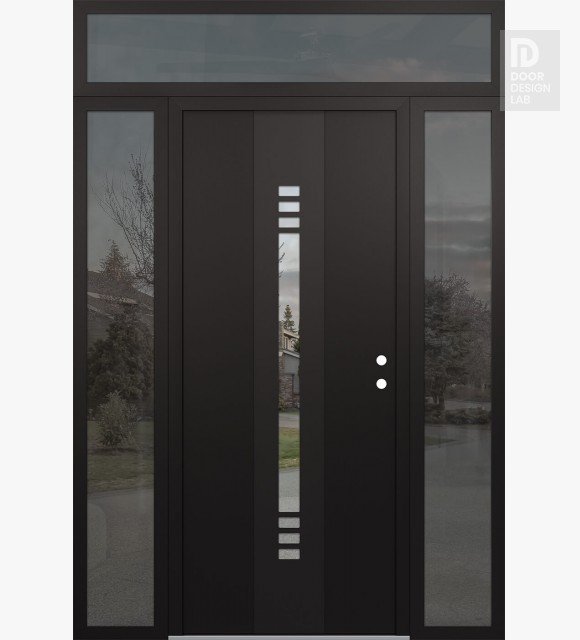 Modern Steel Front Door DIAMOND A5 68" X 96" BLACK/BLACK CLEAR GLASS PANEL BLACK RHI WITH 2 SIDELITES AND TRANSOM MIRRORED GLASS