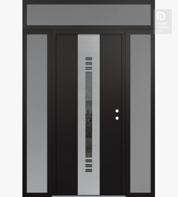 Modern Steel Front Door DIAMOND A5 68" X 96" BLACK/BLACK MIRRORED GLASS PANEL STAINLESS STEEL RHI WITH 2 SIDELITES AND TRANSOM FROSTED GLASS