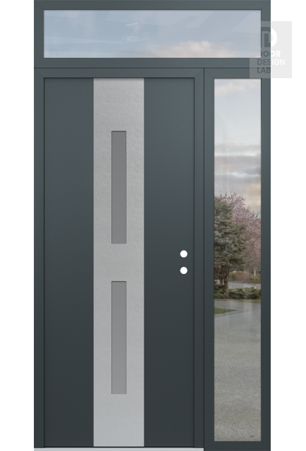 Modern Steel Front Door DIAMOND A6 48" X 96" ANTHRACITE/ANTHRACITE FROSTED GLASS PANEL STAINLESS STEEL RHI WITH SIDELITE AND TRANSOM CLEAR GLASS