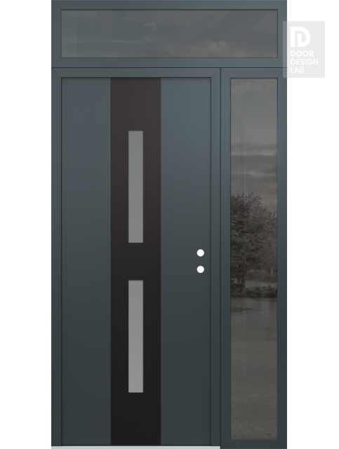 Modern Steel Front Door DIAMOND A6 52" X 96" ANTHRACITE/ANTHRACITE FROSTED GLASS PANEL BLACK RHI WITH SIDELITE AND TRANSOM MIRRORED GLASS