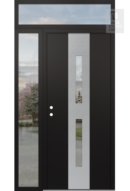 Modern Steel Front Door DIAMOND A6 52" X 96" BLACK/BLACK CLEAR GLASS PANEL STAINLESS STEEL LHI WITH SIDELITE AND TRANSOM CLEAR GLASS