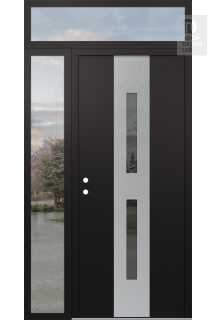 Modern Steel Front Door DIAMOND A6 52" X 96" BLACK/BLACK MIRRORED GLASS PANEL STAINLESS STEEL LHI WITH SIDELITE AND TRANSOM CLEAR GLASS