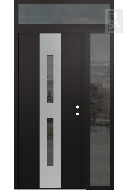Modern Steel Front Door DIAMOND A6 52" X 96" BLACK/BLACK MIRRORED GLASS PANEL STAINLESS STEEL RHI WITH SIDELITE AND TRANSOM MIRRORED GLASS