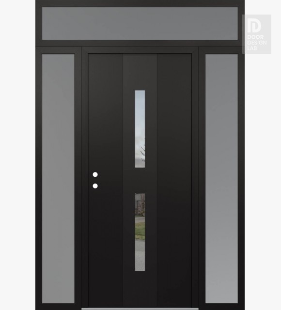 Modern Steel Front Door DIAMOND A6 60" X 96" BLACK/BLACK CLEAR GLASS PANEL BLACK LHI WITH 2 SIDELITES AND TRANSOM FROSTED GLASS