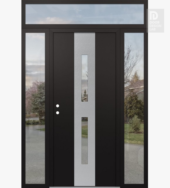 Modern Steel Front Door DIAMOND A6 60" X 96" BLACK/BLACK CLEAR GLASS PANEL STAINLESS STEEL LHI WITH 2 SIDELITES AND TRANSOM CLEAR GLASS