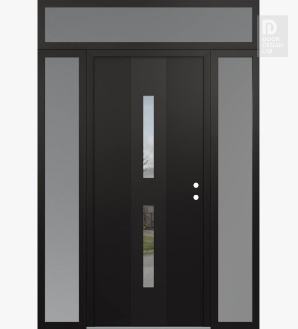 Modern Steel Front Door DIAMOND A6 64" X 96" BLACK/BLACK CLEAR GLASS PANEL BLACK RHI WITH 2 SIDELITES AND TRANSOM FROSTED GLASS