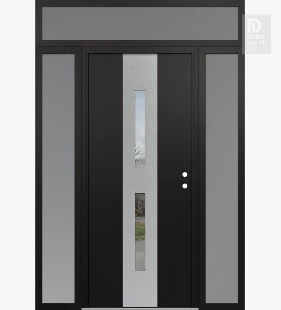 Modern Steel Front Door DIAMOND A6 64" X 96" BLACK/BLACK CLEAR GLASS PANEL STAINLESS STEEL RHI WITH 2 SIDELITES AND TRANSOM FROSTED GLASS