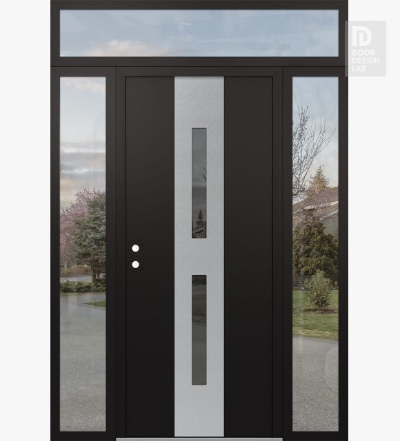 Modern Steel Front Door DIAMOND A6 64" X 96" BLACK/BLACK MIRRORED GLASS PANEL STAINLESS STEEL LHI WITH 2 SIDELITES AND TRANSOM CLEAR GLASS