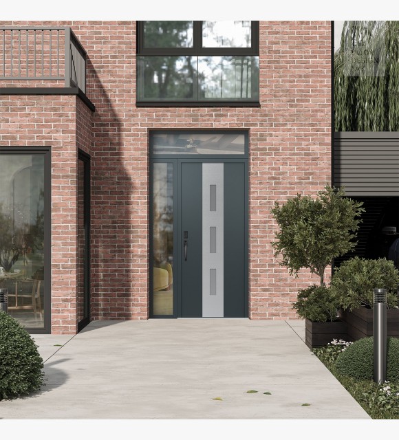 Modern Steel Front Door DIAMOND A7 48" X 96" ANTHRACITE/ANTHRACITE FROSTED GLASS PANEL STAINLESS STEEL RHI WITH SIDELITE AND TRANSOM CLEAR GLASS