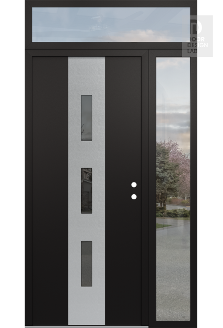 Modern Steel Front Door DIAMOND A7 48" X 96" BLACK/BLACK MIRRORED GLASS PANEL STAINLESS STEEL RHI WITH SIDELITE AND TRANSOM CLEAR GLASS